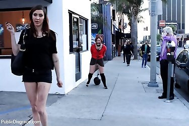 Jodi Taylor is bound in handcuffs and given a crotch rope of unforgiving steel attached to a heavy metal ball and paraded down a public street. Sticky pads with remote controlled electricity are added to the backs of her thighs causing her to yelp and squirm uncontrollably while the public watches. Like a dog she drinks from a water bowl and has what she cannot finish thrown in her face. She is then taken into a bar where she is ass fucked, slapped, spit on and humiliated before being chained in the bathroom and left to be used by strangers.